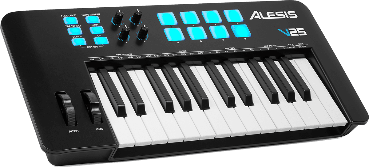 This second version of the popular Alesis V25 keyboard has been developed to provide the ideal production platform for all home-students with its clean but efficient interface. The V25 MkII features 25 velocity-sensitive notes and octave change buttons. The V25 is equipped with a pitch and modulation wheel and four MIDI-assignable knobs for even more expressive playing.