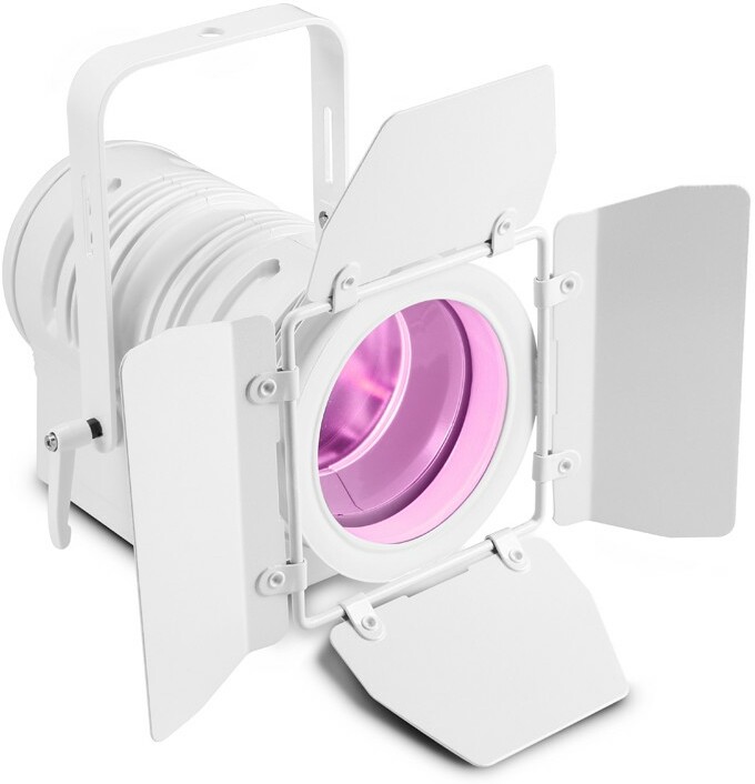 The DMX features of the projector include an adjustable flash rate flash strobe from 1 to 20 Hz and a selection of dimming curves. Sound activation and built-in automated programs allow stand-alone operation, while the 3,600 Hz refresh rate ensures flicker-free performance. The TS 60 RGBW WH comes in a robust metal housing with efficient convection cooling. It offers a 4-button display for easy setup, 3-pin DMX connectors and IEC power input. The assembly includes a rotating barn door forming a bundle and a color filter frame.