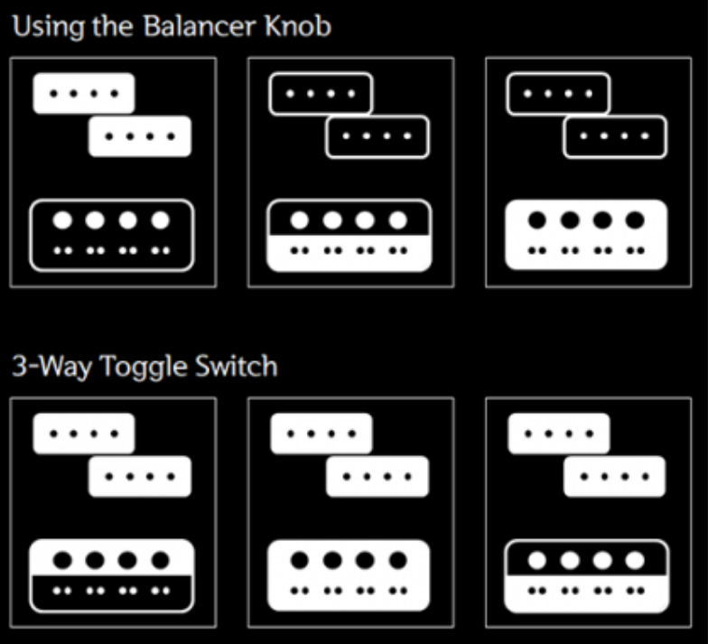 - Volume, pickups balancer, 3 positions switch (3 different bridge pickup wirings + neck pickup), 2-Band EQ Passive Tone, Push-Pull (Active/Passive)
