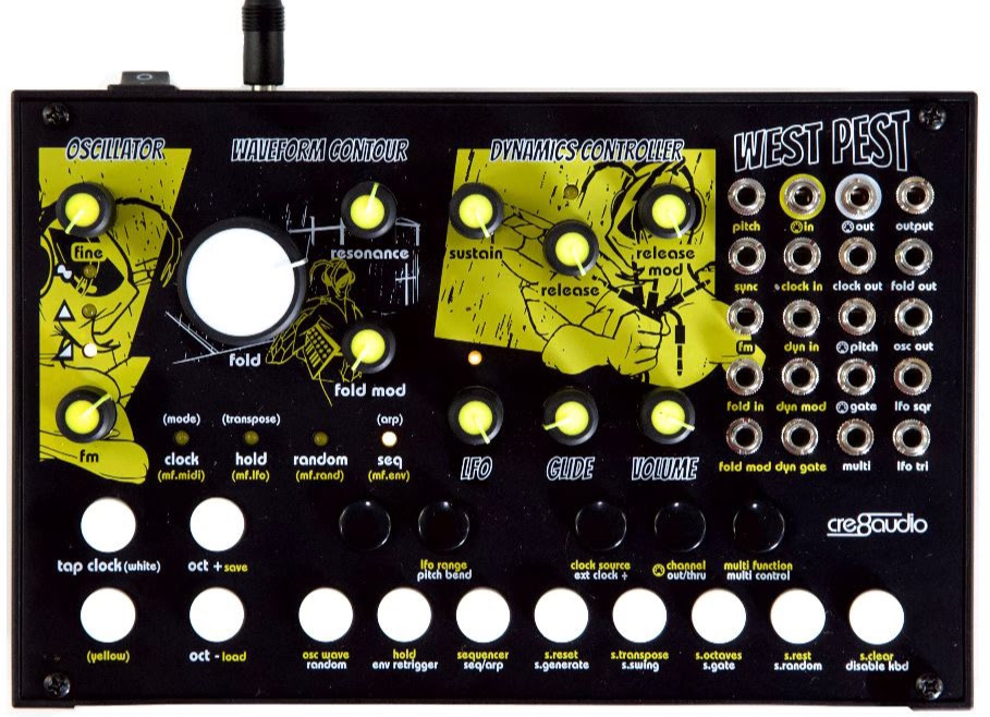West Pest by cre8audio is an analog desktop synthesizer with semi-modular design and West Coast borrowings. The signal flow is typical for an electronic sound generator, close to the Buchla philosophy. The tuning stable oscillator offers sine, triangle, and rising sawtooth, which is perfect for working with the following wavefolder. The wavefolder creates new sounds from the incoming audio signal, ranging from subtle overtone enhancement to total spectral devastation. Often these sounds have a rather metallic character, but this should not be confused with ring modulation. The final shaping of the rich basic sound is done in the VCA, whose control behavior is determined by sustain and release parameters. There is also an LFO whose frequency extends into the audio range. You can hear the years of experience of Pittsburgh Modular, who have contributed significantly to this compact instrument.