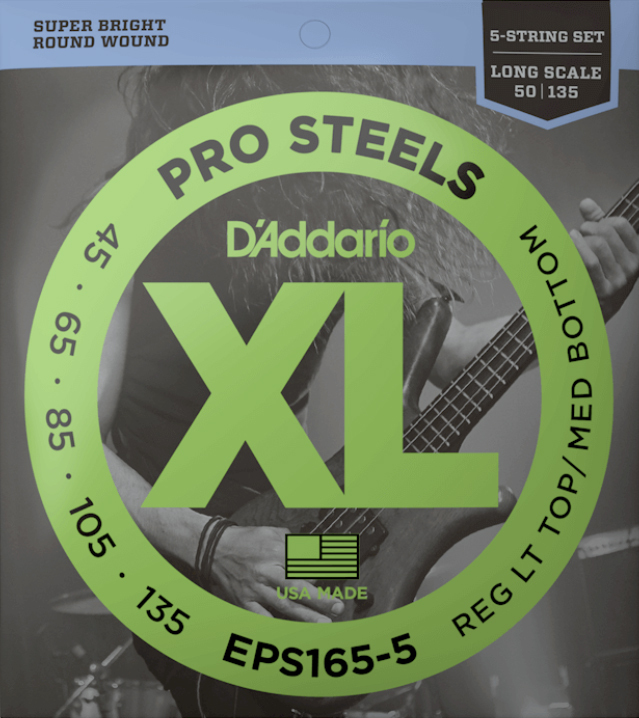 D'ADDARIO EPS165 4-String Set ProSteels Round Wound Electric Bass Long Scale Regular Light Top / Medium Bottom 45-105 are D’Addario’s brightest bass guitar strings. The unique, highly magnetic alloy in ProSteels delivers super-bright tone with magnified presence and attack. Made with a high carbon steel core and stainless steel wrap wire, ProSteels produce enhanced interaction with magnetic pickups, offering a palette of harmonically rich, brilliantly penetrating highs, combined with pronounced, tight-and-tough lows.