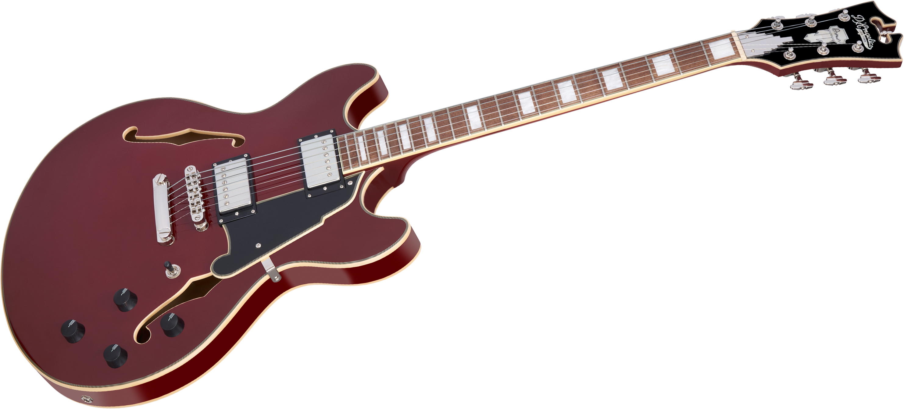 Equal parts modern and classic, the D'ANGELICO Premier DC (DAPDCBRDNS) is a versatile double-cutaway semi-hollow offering a huge range of tones. Custom-voiced humbuckers provide sweet, focused mid-range and vivid high-end, yielding balanced and bold tone. The DC's 16-inch-wide body offers remarkable sustain while a modern, slim-C neck shape with a seamless heel transition offers standout comfort. Equally suited across genres, the Premier DC's tones are as diverse as they are rich—from round, clean jazz to bright, searing rock. Four ebony knobs allow for fine-tuning tone.