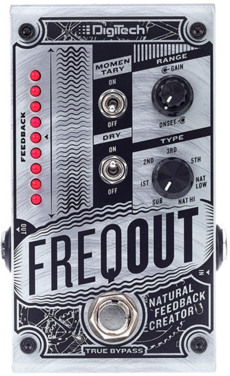 The DigiTech FreqOut Natural Feedback Creator allows you to get sweet, natural feedback at any volume, with or without distortion. The FreqOut is perfect for situations where volume must be controlled like in the studio, with in ear monitors, or low-volume performance and practice. However, the FreqOut can also be used at gig volume to focus out-of-control feedback on a preferred harmonic at any stage position.