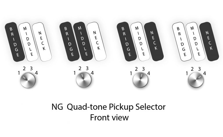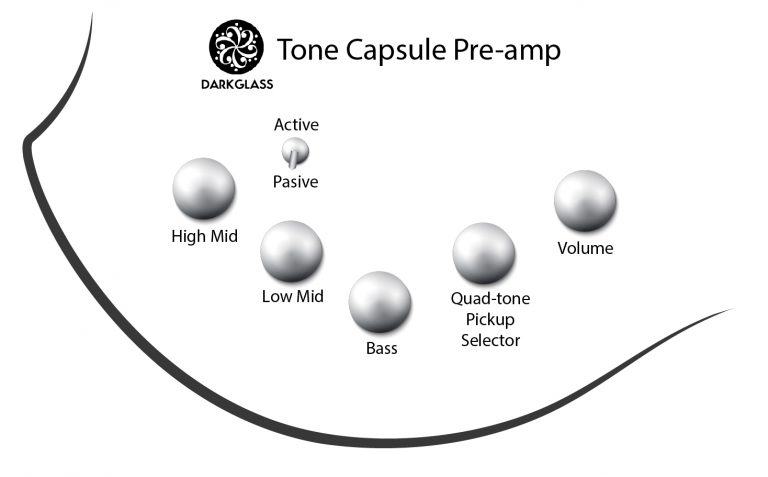 - Vol, 4-way rotary pickup selector, Bass, Mid, Treble, Active/Passive switch