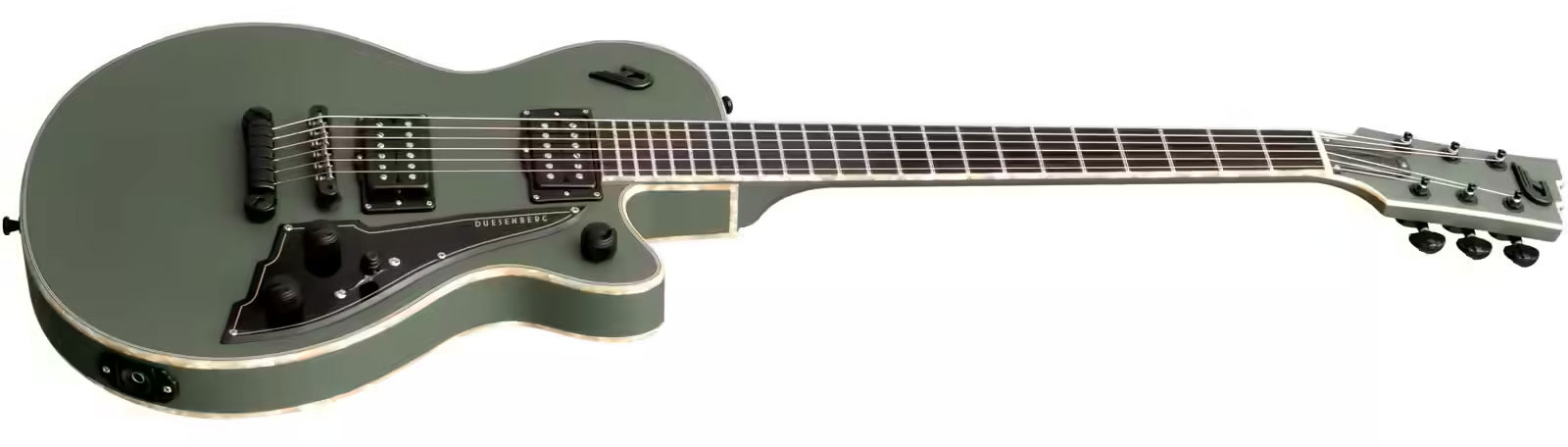 Mainly composed of Mahogany and Ebony, the DUESENBERG Fantom Series A (Matte Olive) solid body electric guitar is a mighty rock-machine with some unique twists.