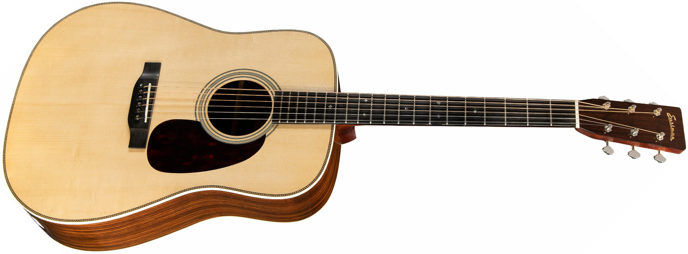Handmade in the Eastman worshop, the EASTMAN Traditional E20D Natural is a stunning all-solid dreadnought acoustic guitar. Adirondack Spruce top, Rosewood back/sides, Ebony fretboard.