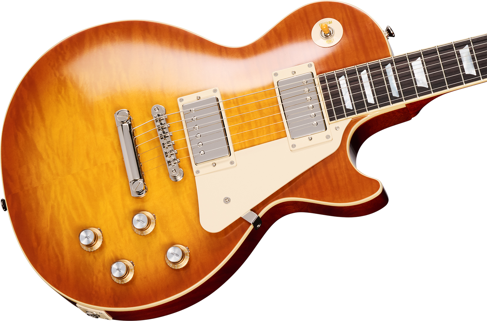 size as on vintage 1960 Les Paul Standard models and are placed in historically accurate locations. The genuine mahogany body features a carved maple cap that is topped with a beautiful AAA flamed maple veneer.
