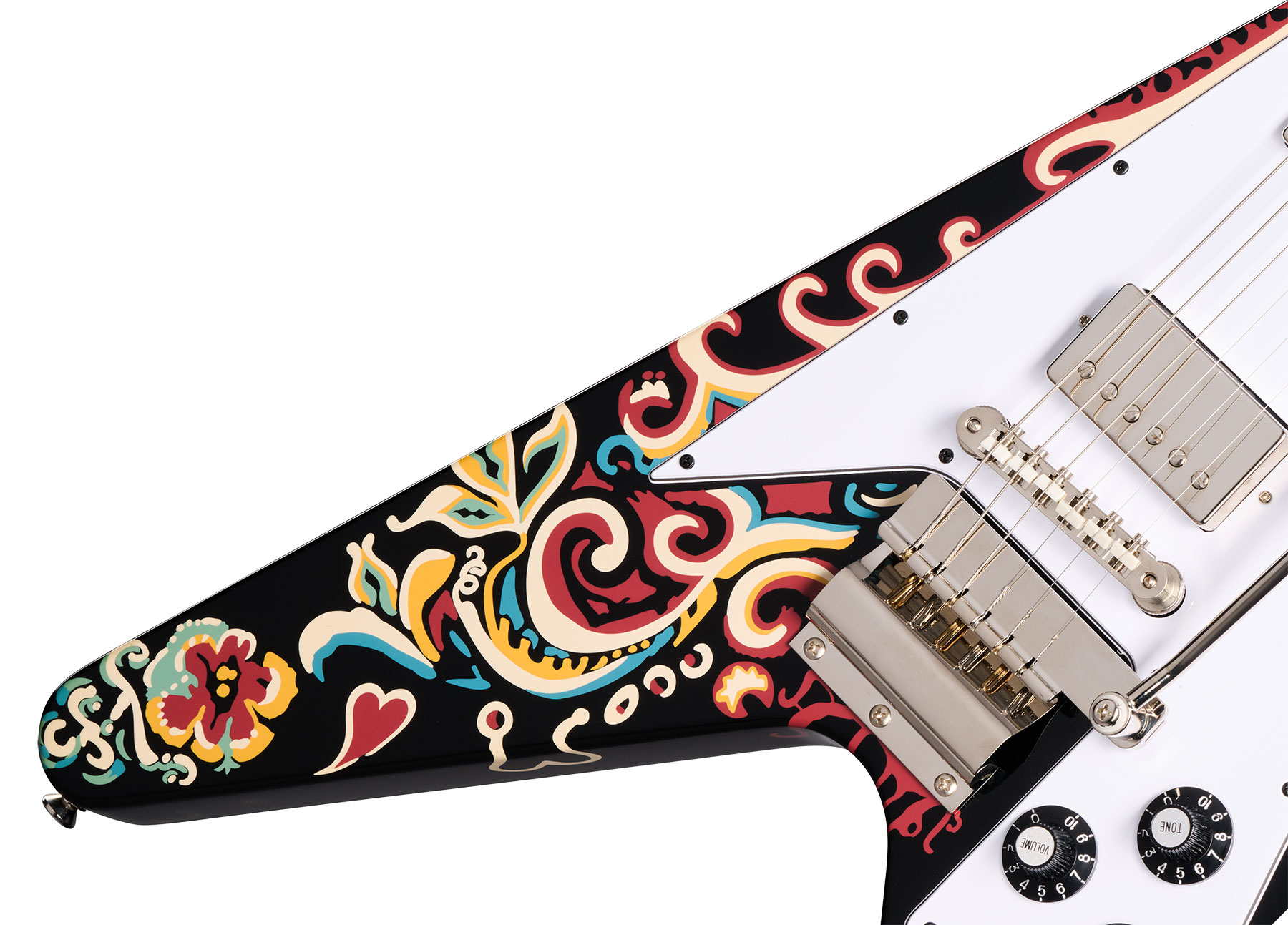 Originally a Sunburst, Jimi Hendrix customized his Ebony-refinished Gibson™ Flying V with psychedelic graphics that he hand-painted, which are recreated here. The Jimi Hendrix “Love Drops” Flying V also features a mahogany body, a one-piece mahogany neck with a rounded C profile, a laurel fretboard, and 22 medium jumbo frets.