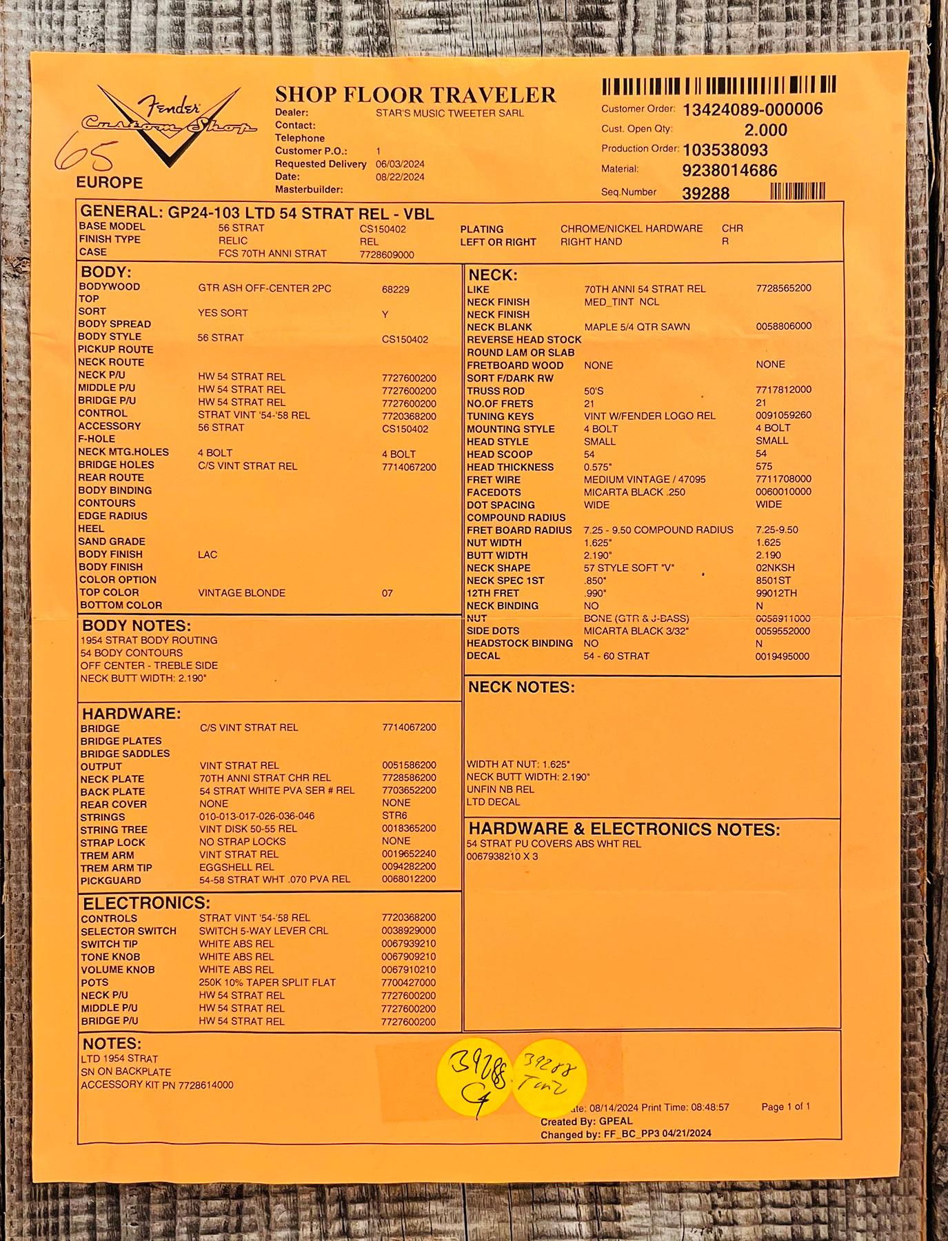 - Model : FENDER Custom Shop Limited Edition 70th Anniversary 1954 Stratocaster Relic Vintage Blonde