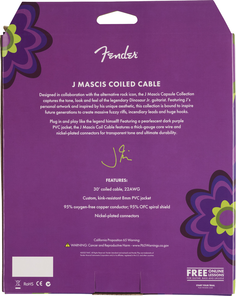 Designed in collaboration with the alternative rock icon, the FENDER J Mascis Coiled Instrument Cable, 30ft, Straight/Angle, Purple (0990823026) captures the tone, look and feel of the legendary Dinosaur Jr. guitarist. Showcasing J’s personal artwork and inspired by his unique aesthetic, this collection is bound to inspire future generations to create massive fuzzy riffs, incendiary leads and huge hooks.