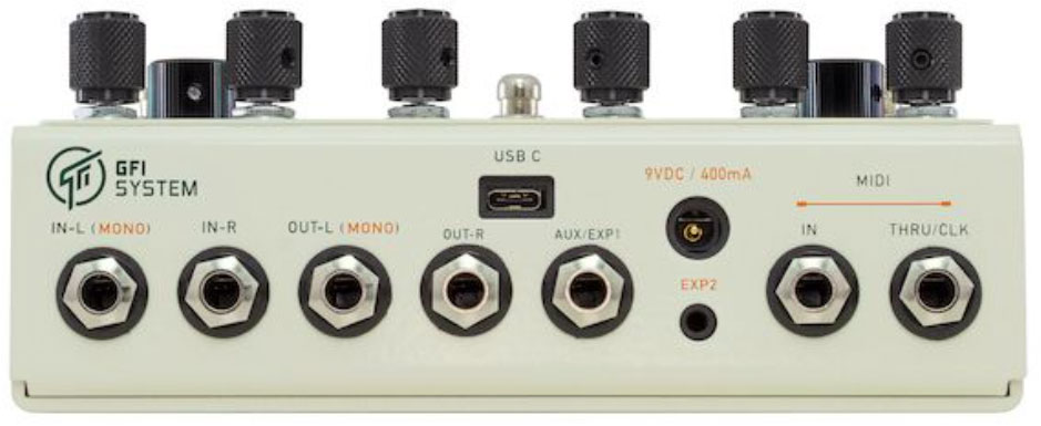 Expansive External Control with two expression pedal inputs (with CV compatibility), three external switches for additional control (bank up/down, tap tempo, etc) and MIDI In / MIDI Thru/Clock.