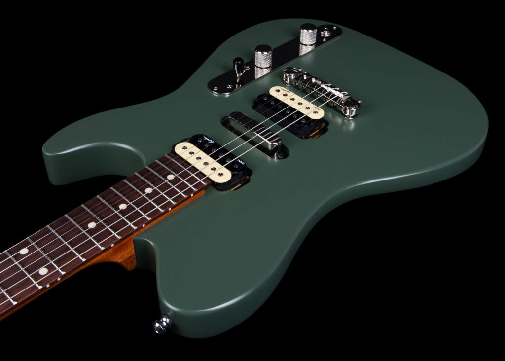 offers an H-S-H pickup configuration for a multitude of tonal possibilities with a pair of hot Custom Godin Zebra Humbuckers and a Godin Custom Cajun Nickel in the middle. It also presents other unique features compared to the more traditional single cutaway solid-bodies, such as a short-scale (24.75”) set-neck and a highly stable 3&3 headstock design for comfortable playing and bending. The guitar also comes equipped with a re-invented vintage-style control plate, which has a volume, push-pull tone, and an angled 5-way switch that follows the natural sweep of your right hand for easy pickup selection. This model has a Canadian Laurentian Basswood body with an eye-catching Matte Green semi-gloss finish and a Mahogany neck, topped by a Rosewood fretboard. The Radium Matte Green…taking it up a notch!