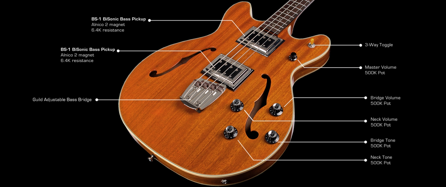 The addition of the BiSonic BS-1 neck pickup on the GUILD Newark St. Collection Starfire II Bass (Natural) gives bassists a warmer, smooth sound for added tonal flexibility. This double cutaway bass guitar features an arched laminate mahogany top and back, and mahogany sides, dual Guild BS-1 pickups, individual volume, tone, and master volume knobs, and a pickup selector switch. A clear, high gloss finish highlights this bass guitar’s natural beauty. Available in Black, Emerald Green, Natural, or Cherry Red.