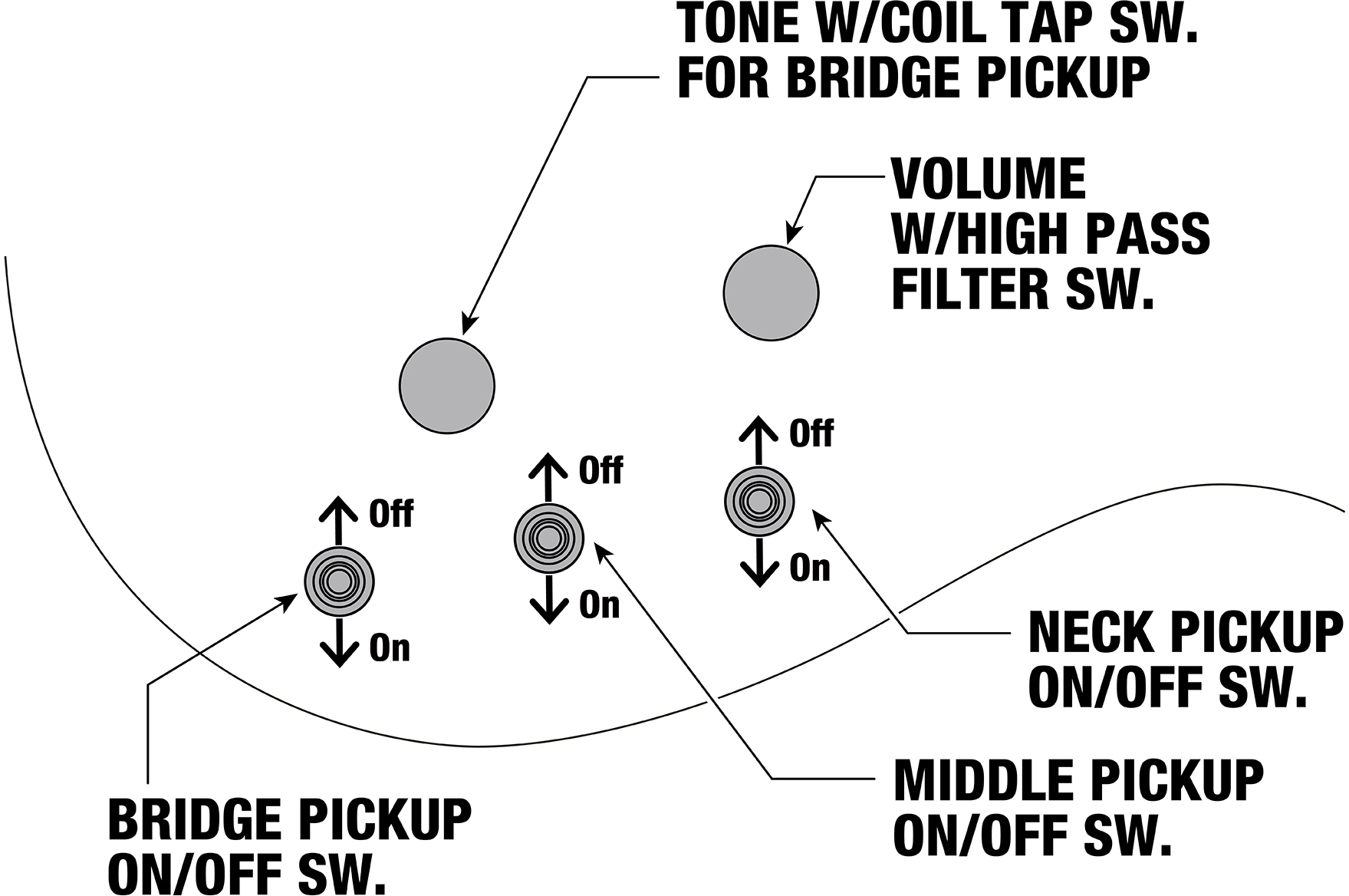 A high pass filter on the volume pot maintains highs at low volumes. The push/pull coil tap adds sound and tonal variations for pickups. With three on/off switches for evry pickup, the JS2GD offers fourteen sounds options.