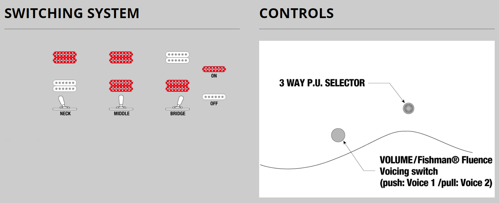 Fishman Fluence Modern humbucking pickups (AlNiCo V in the neck and Ceramic VIII in the bridge) associated with push-pull control allow to select between two voicings for each pickup.