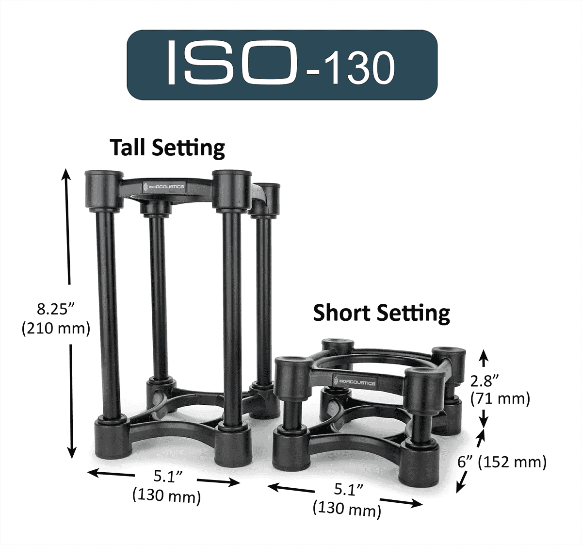 ISO Stands are the latest generation of IsoAcoustics stands designed for studio monitors. They offer 14 height and tilt variations to optimize the placement of your monitors and properly orient your tweeters towards the ears. The width of the ISO 130 is 130mm and its depth is 152mm.