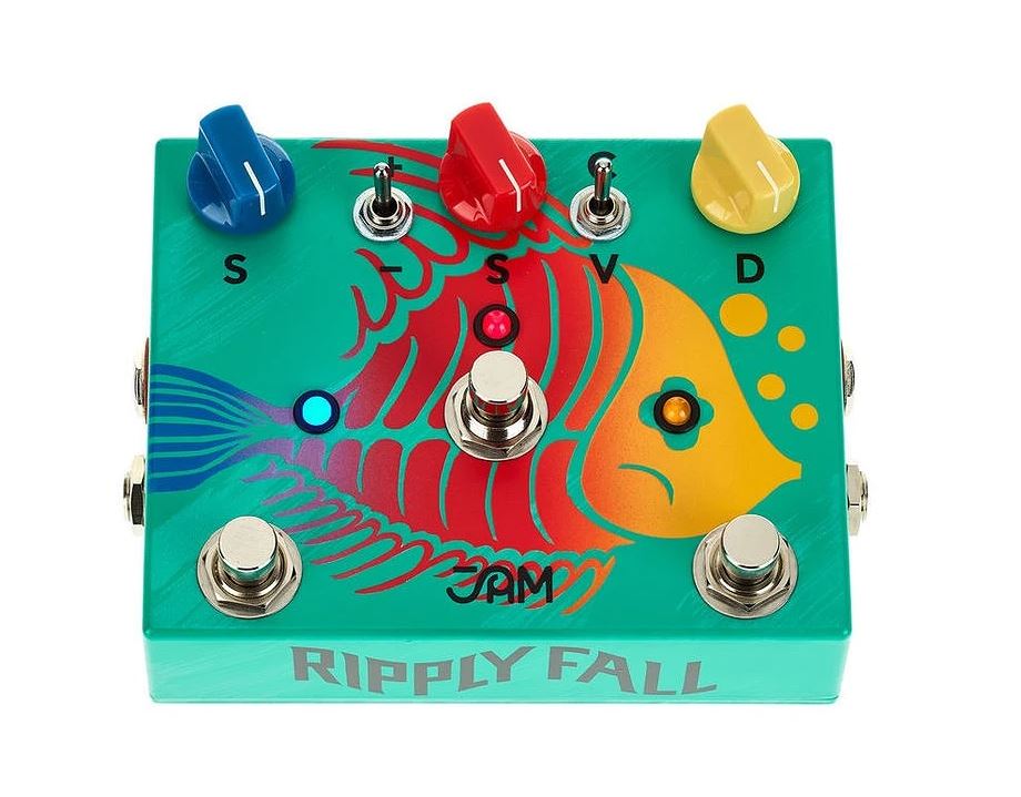 The JAM Ripply Fall modulation effect pedal merges the Waterfall and the Ripple. These two pedals in one box still work as stand-alone units but also feature a couple of new cool things. First of all combining these two pedals together gives you lush modulation including some great modern Univibe tones.