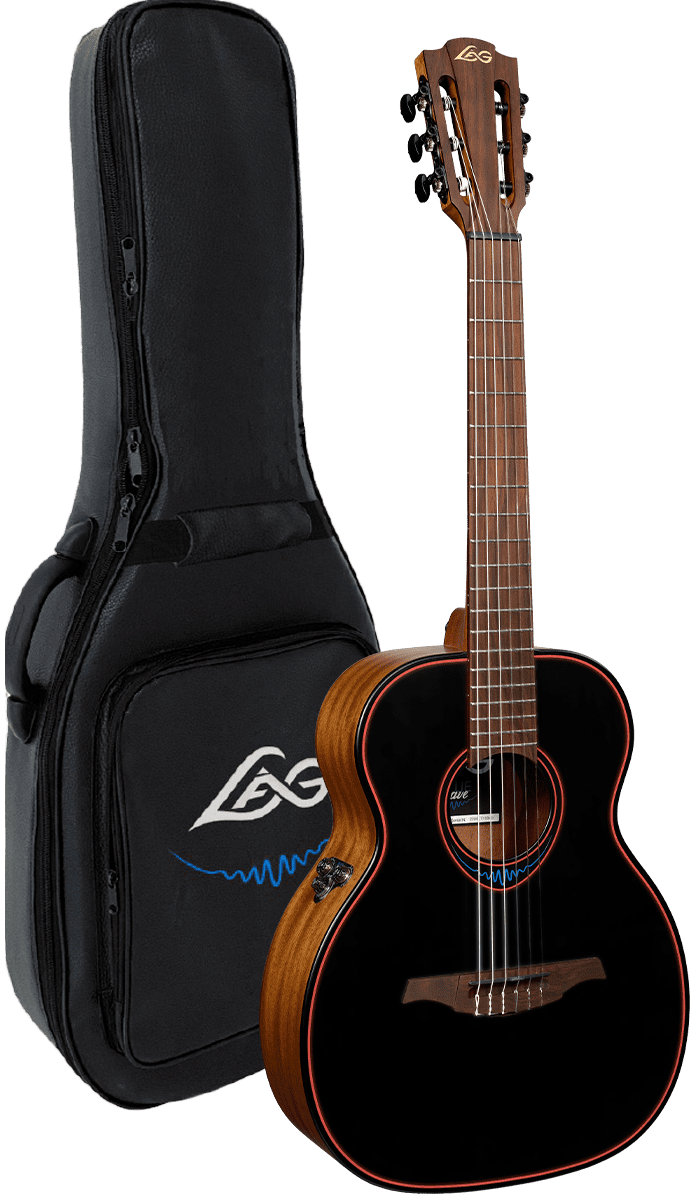 LAG Smart BlueWave 1 TNBW1TE Classical Nylon acoustic/electric guitar features solid Cedar top, layered Khaya back/sides, Khaya neck, Brown Brankowood (alternative for Rosewood) and BlueWave preamp with built-in reverb, delay effects and Bluetooth connection.
