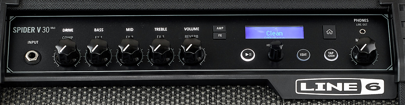 LINE 6 Spider V 30 MkII is a solid-state/modeling 30 watts electric guitar amplifier / combo, featuring 1x 8" speaker plus tweeter, 200 amplifiers/effects/cabinets models, 128 presets, tuner, metronom and drum loops (19 created by professional drummers).