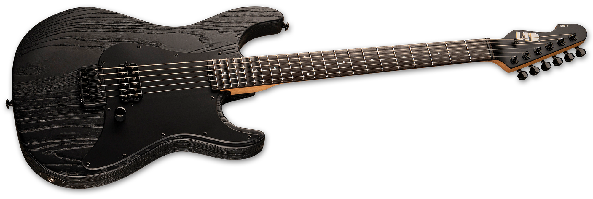 Built to the outstanding quality of LTD Deluxe 1000 Series and designed to offer the tone, feel, looks and quality that working professional musicians require in an instrument, the SN-1 HT is a single-pickup, hardtail version of the SN Series. You’ll first notice its outstanding textured sandblasted finish in Black, with matching black components and black matte pickguard. The LTD BY ESP SN-1 HT (BKBT) solid body electric guitar features bolt-on construction at 25.5” scale, with a swamp ash body and thin U-shaped roasted maple neck with 22 extra-jumbo stainless steel frets and dot abalone inlays. This guitar’s sound is driven by a Fishman Open Core Classic pickup with a push-pull control to activate its multiple voicings. The SN-1 HT also includes a Hipshot hardtail bridge with string-thru-body, and LTD locking tuners.