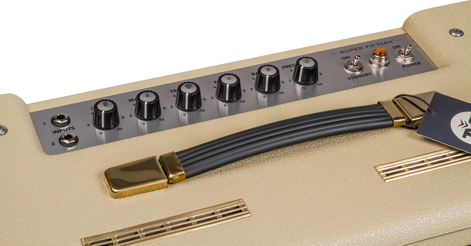 Super Fifteen is the master volume model for professionals and amateurs alike. Enjoy 15 watts of dual EL-84 tubes for British sparkle, chime, and gain, in a compact size. Perfect for a medium sized club. Speaker emulation feature for silent practice, so you can use with the headphone jack with separate volume control, or go direct to console or computer. The feature packed Super Fifteen is light on the back and on the wallet.