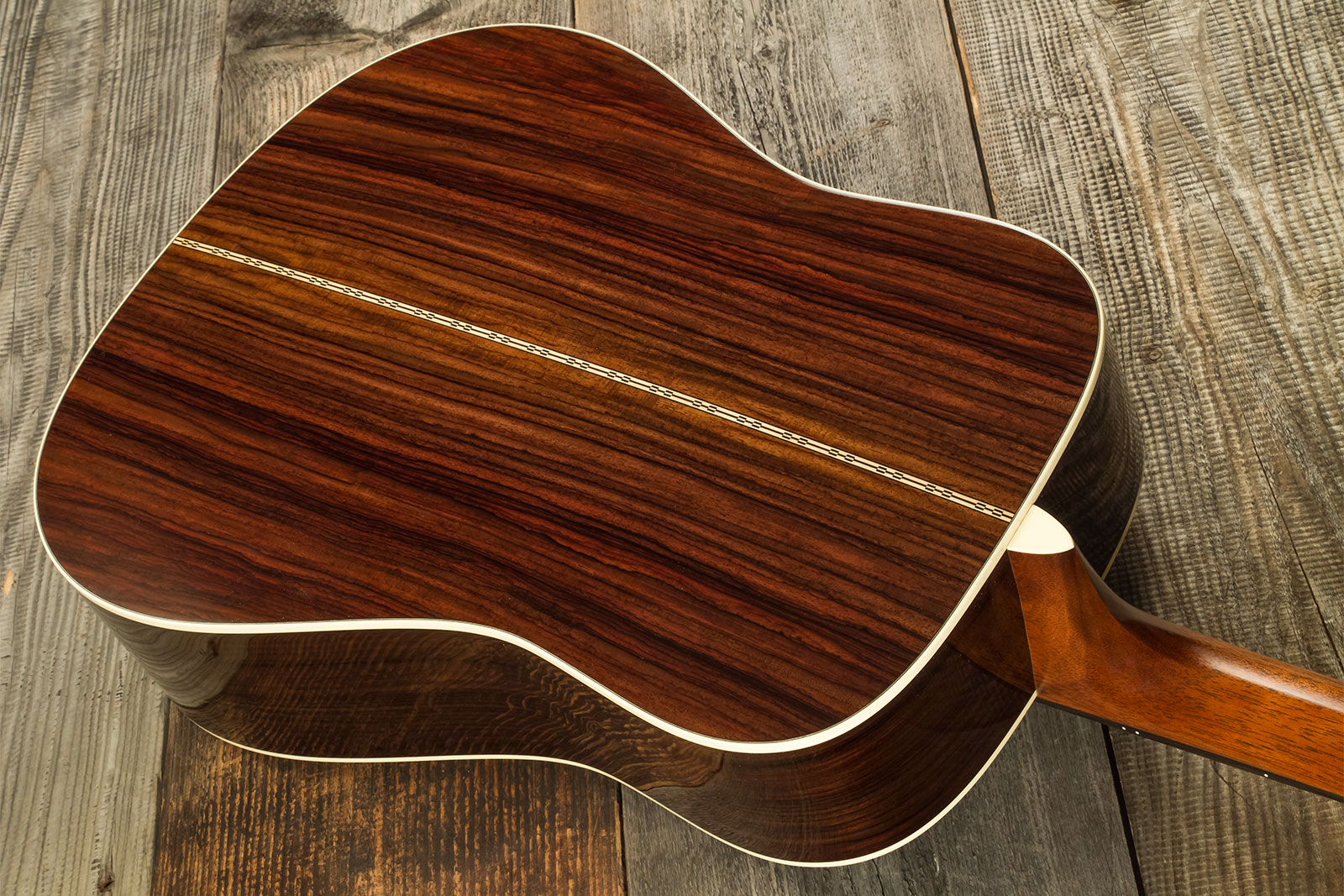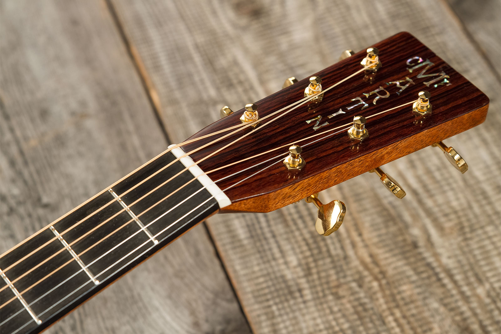 It features Solid Adirondack Spruce top and bracing, solid indian Rosewood back/sides, genuine solid Mahogany neck with Modified Low Oval and High Performance Taper profile, Ebony fretboard.