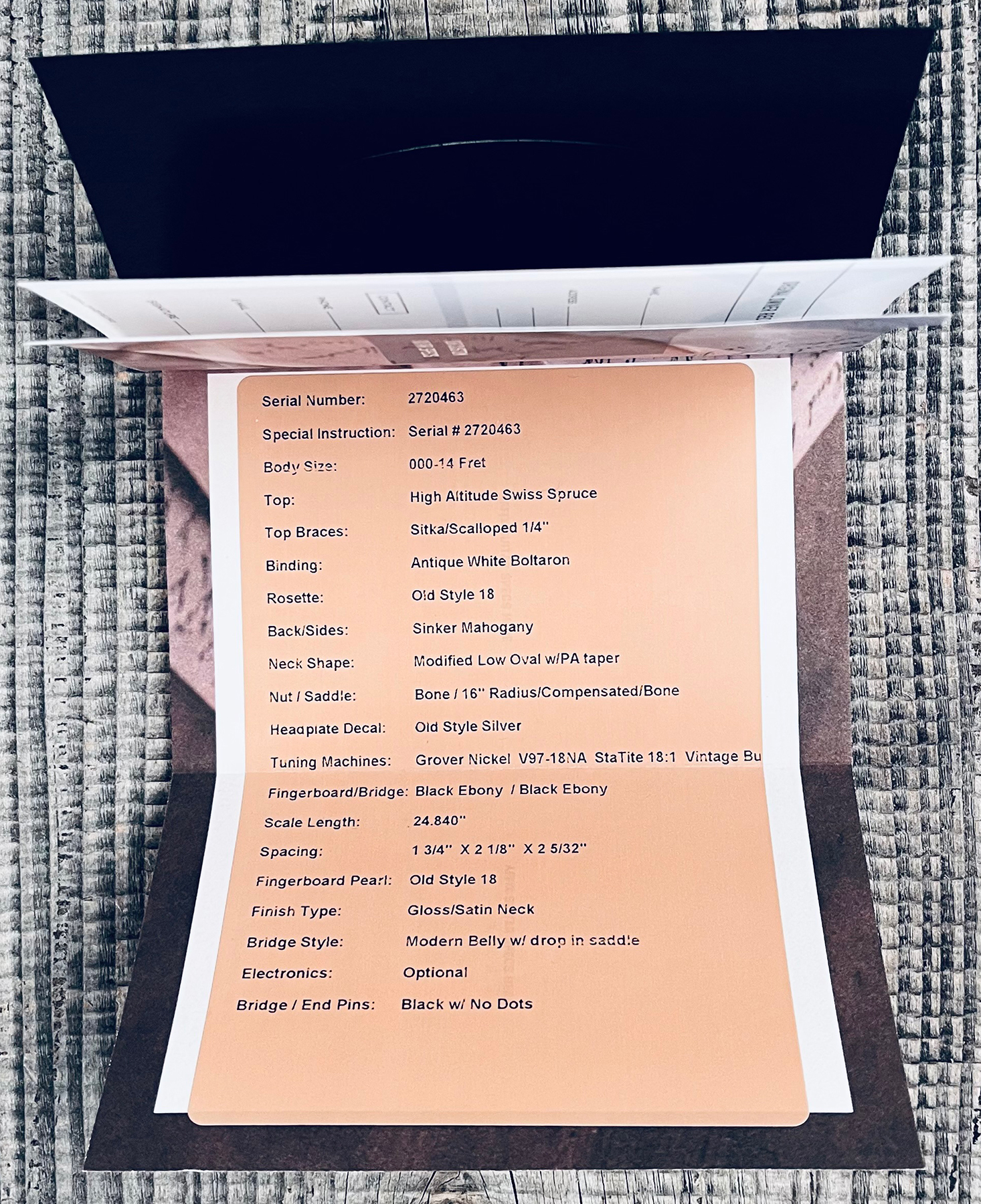 It features Solid European Spruce top, Sitka Spruce bracing, solid Sinker Mahogany back/sides, genuine solid Mahogany neck with Modified Low Oval and High Performance Taper profile, Ebony fretboard.