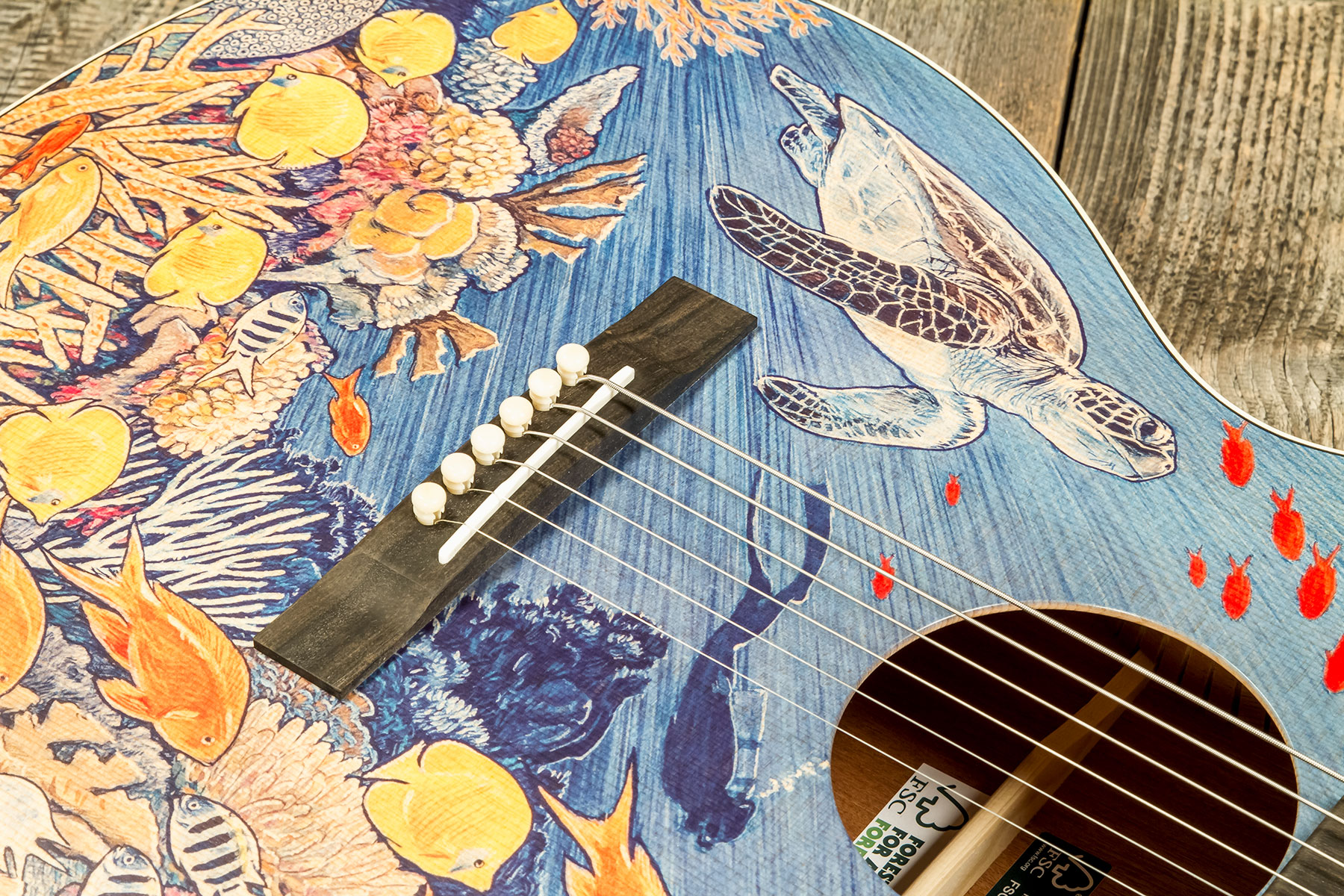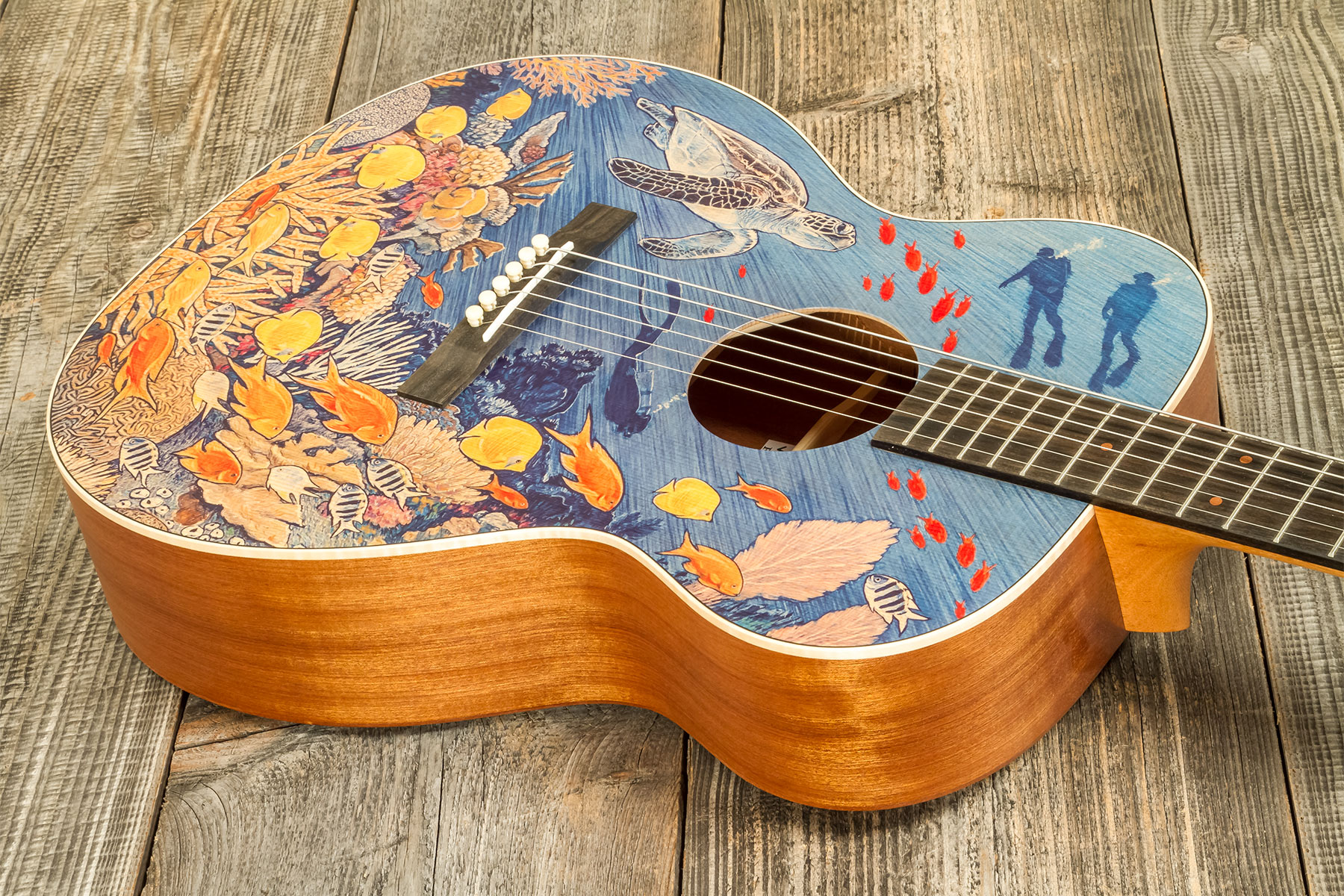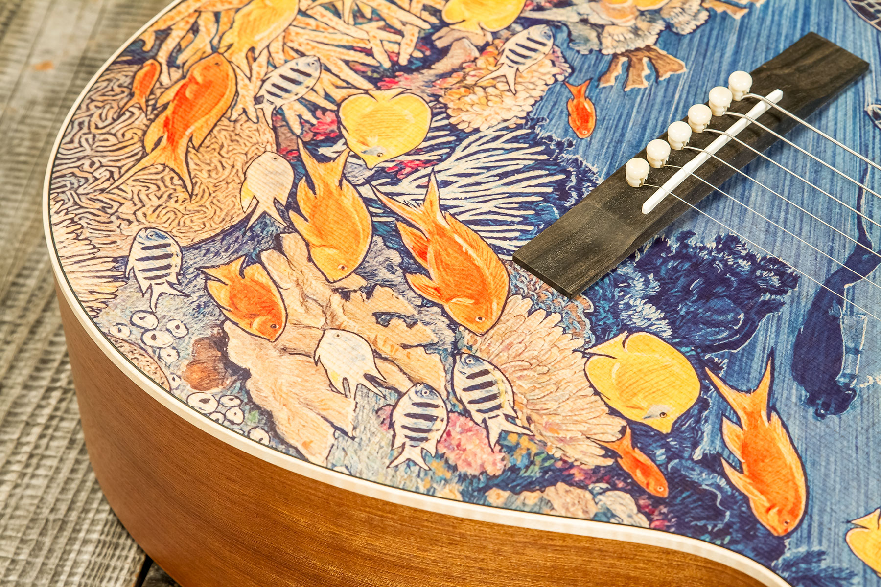 MARTIN GUITAR OM Biosphere acoustic guitar is a call to action on climate change. A reminder to preserve our planet for future generations. To show our support for the preservation and replenishment of coral reefs, which are some of the most diverse and valuable ecosystems on earth, the top is adorned with stunning artwork by renowned artist Robert Goetzl depicting a colorful ocean scene.
