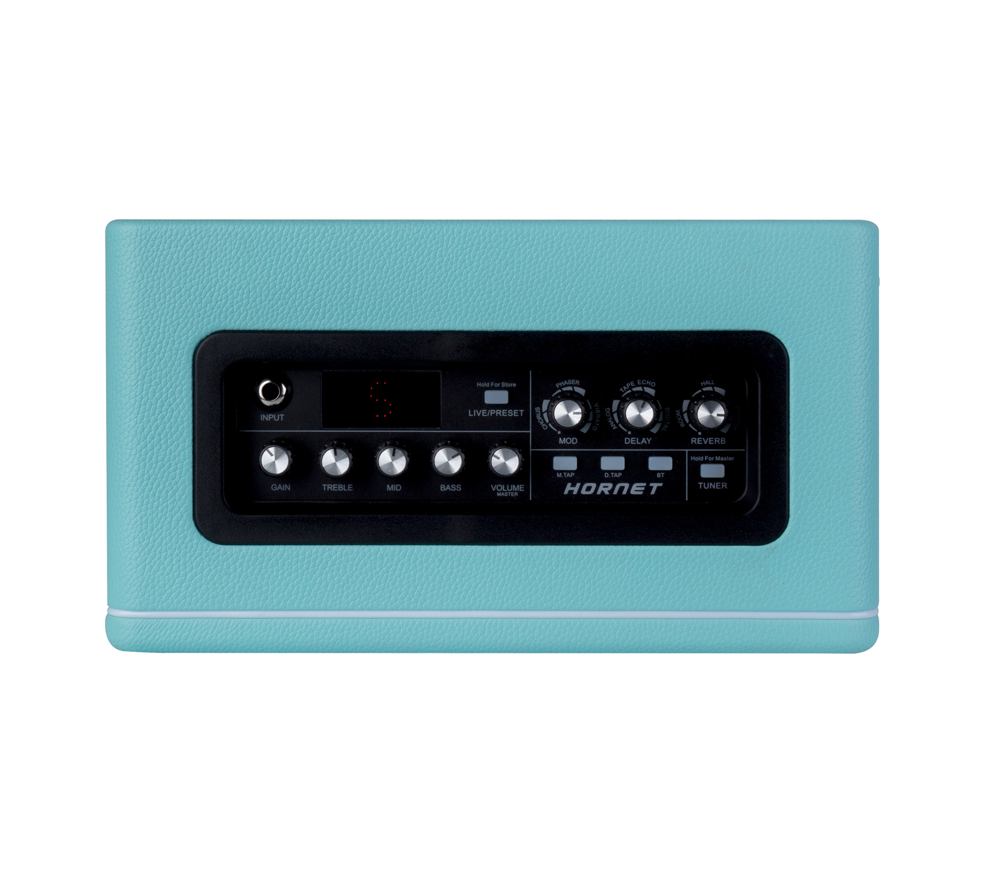 Each amp in the HORNET series has two control modes, namely LIVE (parameters WYSIWYG) and PRESET (parameters can be stored as presets) modes. The 9 amp simulations have adjustable gain, three-band EQ, and individual volume as well as delay and reverb modules that can be independently controlled using TAP Tempo in real time. In addition, the HORNET series has a built-in high-sensitivity tuner and a Bluetooth playback function with adjustable volume levels and includes a headphone out jack for silent practice.