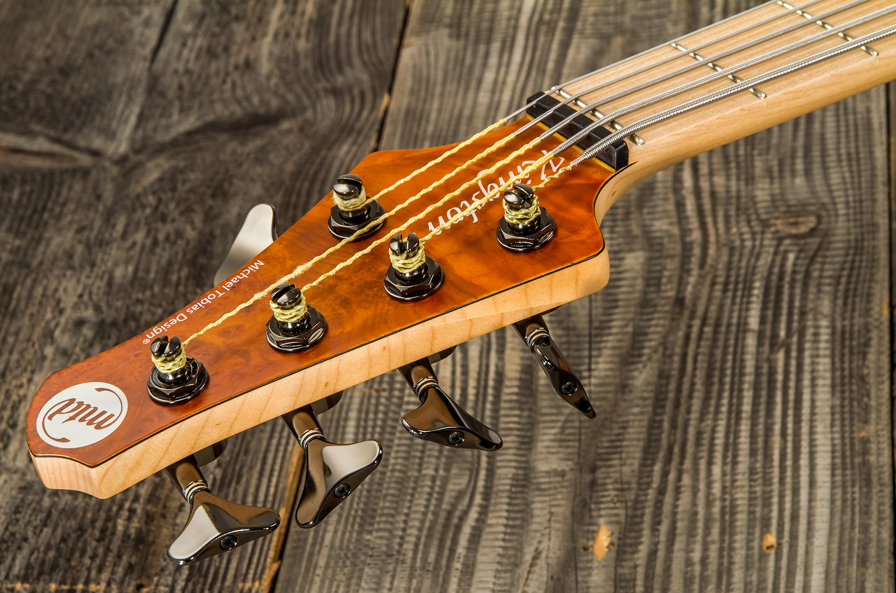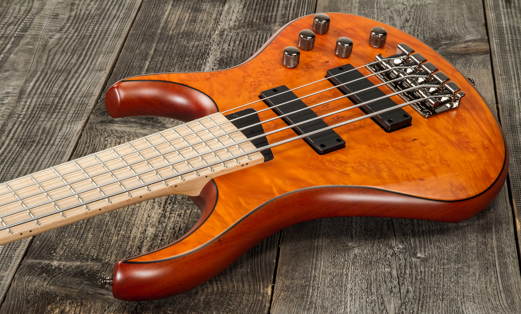 The MICHAEL TOBIAS DESIGN Kingston KZ5MP-SA five strings solid body electric bass features a high quality (and carefully constructed) Mahogany core, with a beautiful Burled Maple top. The carved Mahogany body lends a rich voice and darker overtone to the instrument, while the burl top helps to focus the low end, delivering unparalleled beauty and performance.