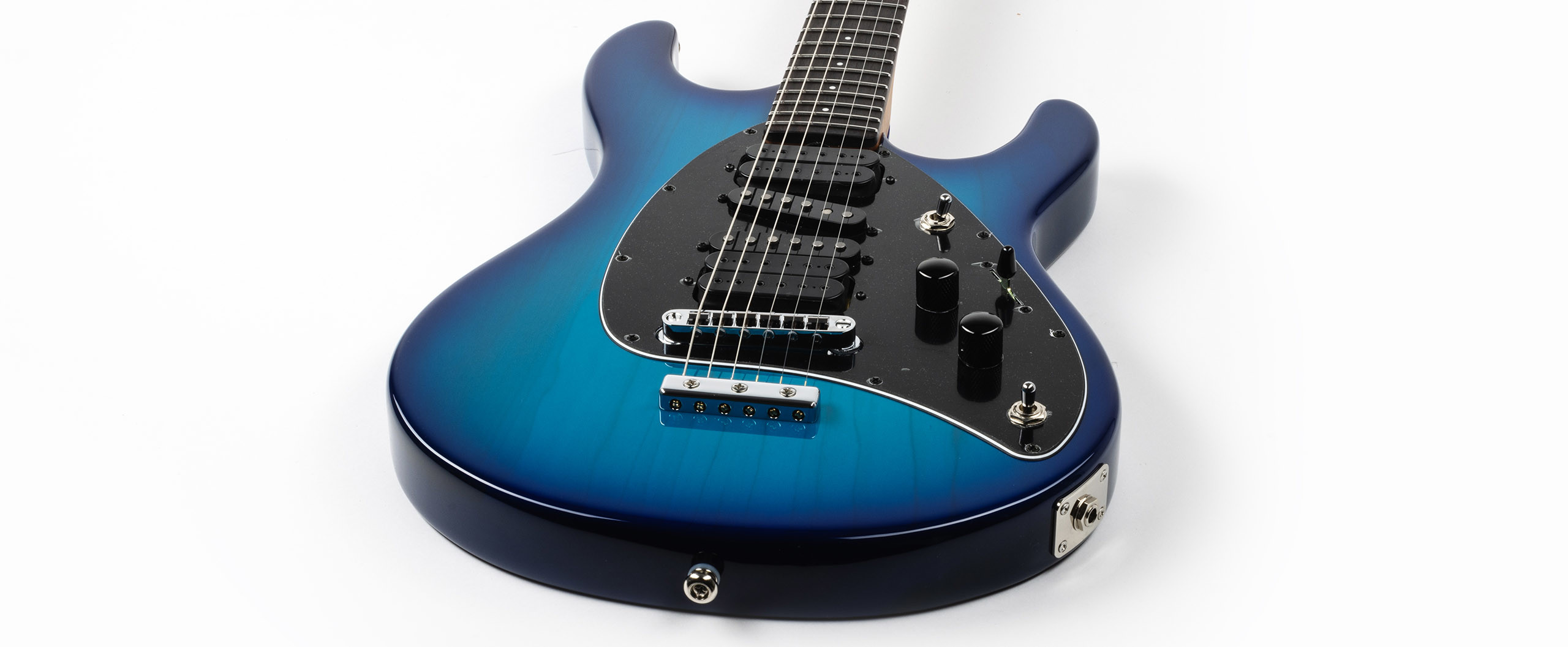 MUSIC MAN Steve Morse (Morse Blue Burst) is a high quality instrument merging traditional construction with ultra flexible electronics featuring one Humbucker DiMarzio DP-205 Morse Signature, one Single coil DiMarzio DP-108 Vintage, one Single coil custom Ernie Ball Music Man and one Humbucker DiMarzio DP-200 Morse Signature.