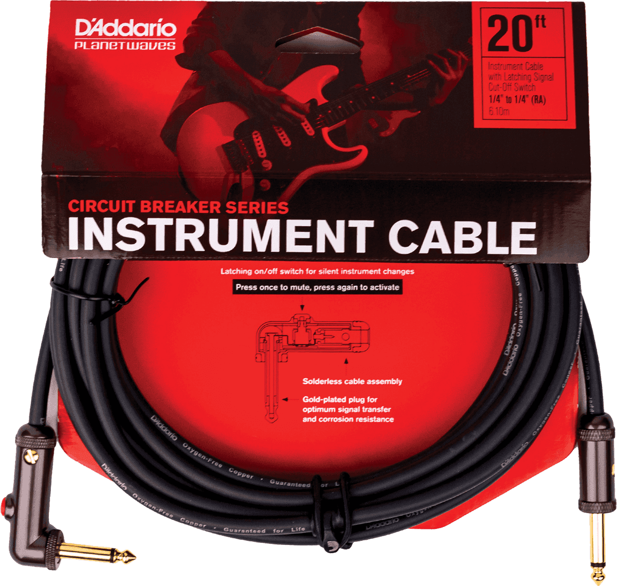 The Planet Waves EPW AGL Circuit Breaker Series instrument cable with Latching Cut-Off Switch has the same solderless plug connection as its predecessor, but features an actuated “kill switch” that allows for noise-free instrument changes. Press the switch once to mute the signal to the amplifier completely. Press again to reactivate the signal flow. Available in straight and right angle plugs in a variety of lengths.