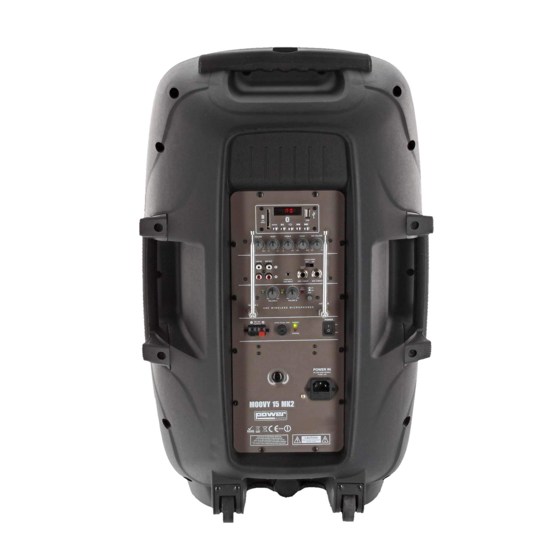The MOOVY 15 MK2 is part of the new range of portable sound systems POWER ACOUSTICS. With its built-in battery, retractable trolley with wheels, VHF wireless microphones and headband microphone, the MOOVY 15 MK2 will be the ideal portable sound system for your performance.