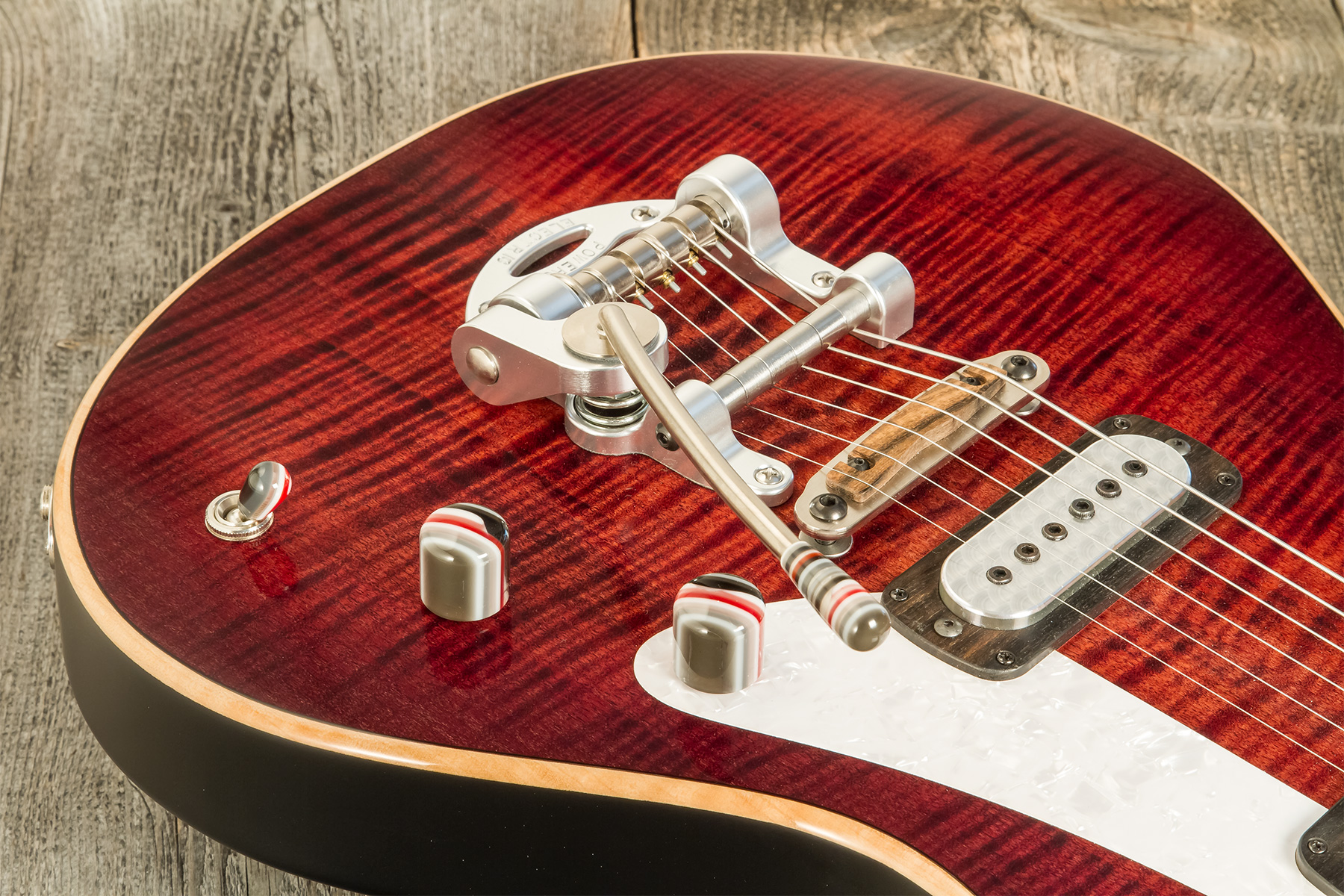 The “camshaft” tailpiece (“CamTail”) tremolo with string ramps compensated for tension and gauge so when you dive on it, the strings move in pitch unison relative to each other (similar to moving chords and maintaining relative pitch on a lap and pedal steel).
