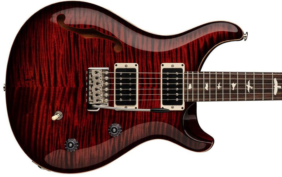 Combining the snap and sustain of a bolt-on guitar with the airy resonance of a semi-hollow body, the PRS USA CE 24 Semi-Hollow (Fire Red Burst)hollow body electric guitar with center block is a truly unique addition to the PRS Bolt-On lineup. The body pairs the traditional combination of a mahogany back and maple top with a bolt-on maple neck and rosewood fretboard. The neck features a Pattern Thin carve and satin nitro finish for a natural, addictive feel. The electronics consist of a volume and push/pull tone control with a 3-way toggle switch, giving a total of six classic sounds from the PRS 85/15 pickups.