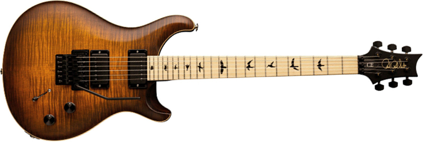The PRS USA Bolt-On Dustie Waring DW CE 24 Floyd (Burnt Amber Smokeburst) solid body electric guitar starts with the PRS CE bolt-on platform and includes a satin-finished maple neck, maple fretboard, a slightly modified Pattern Thin neck carve (Waring’s carve is slightly thinner front to back), and Floyd Rose tremolo system.