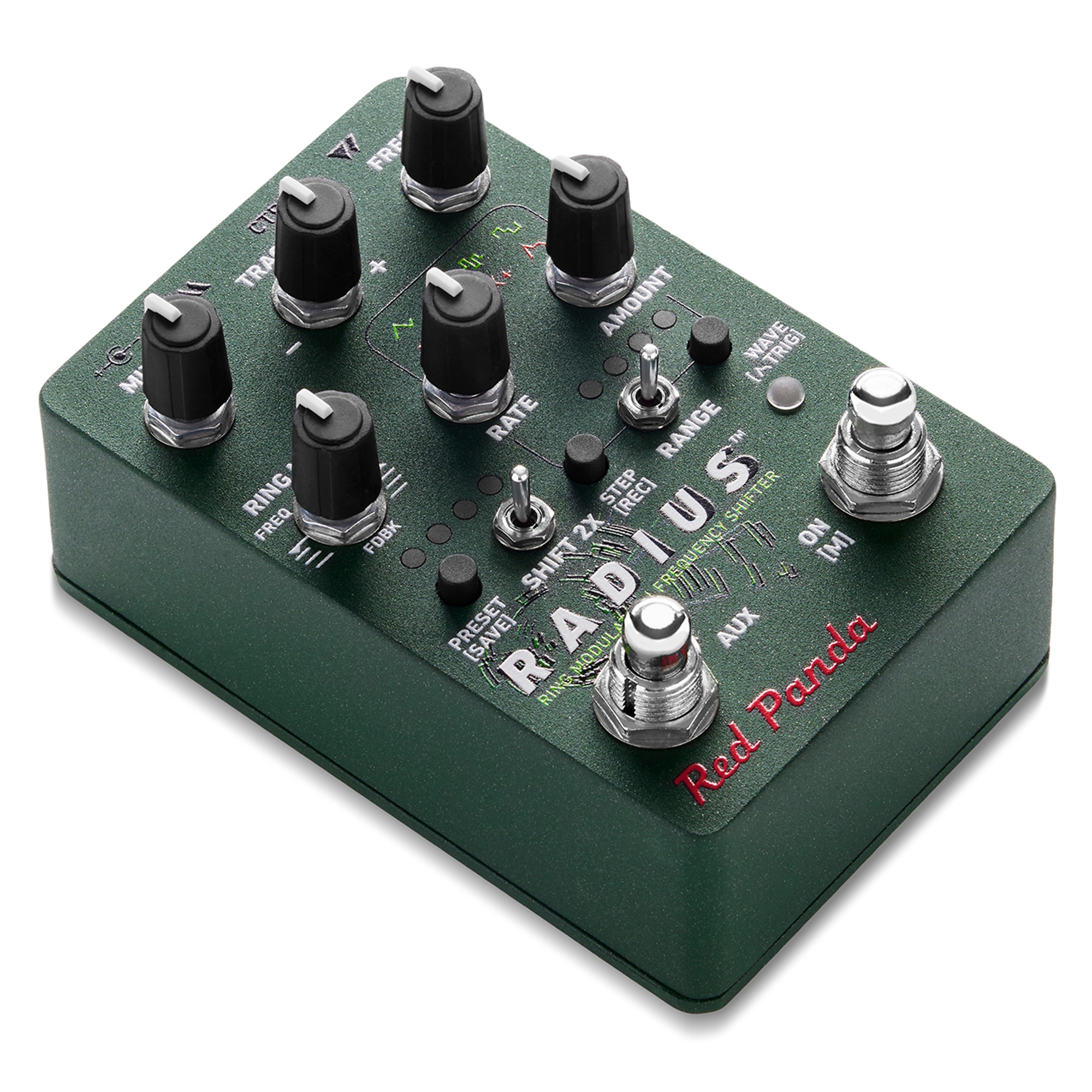 Pitch tracking, a push-to-tune footswitch, and picking dynamics make the Radius responsive and predictable on stage. Hold the left footswitch and play a note to tune the carrier oscillator to that note. Pitch tracking maintains the pitch ratio as you play up and down the scale, or tracks by a ratio (or inverse) for more dynamic sounds. An expression pedal can be assigned to any combination of knobs.