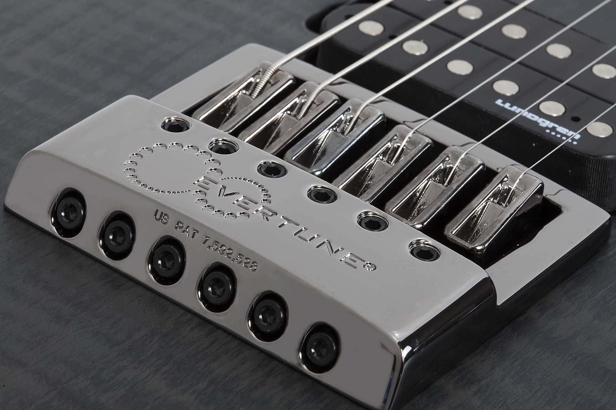 The SCHECTER Banshee Mach-6 Evertune (#1414) is a solid body electric guitar built in South Korea, with Swamp Ash body and neck thru body, 24 frets Ebony fretboard, Lundgren M6 pickup (played by Meshuggah), and and maybe the best bridge on the planet, the Evertune. It delivers constant tension that keeps your guitar in tune and with near perfect intonation up and down the neck under almost any condition.