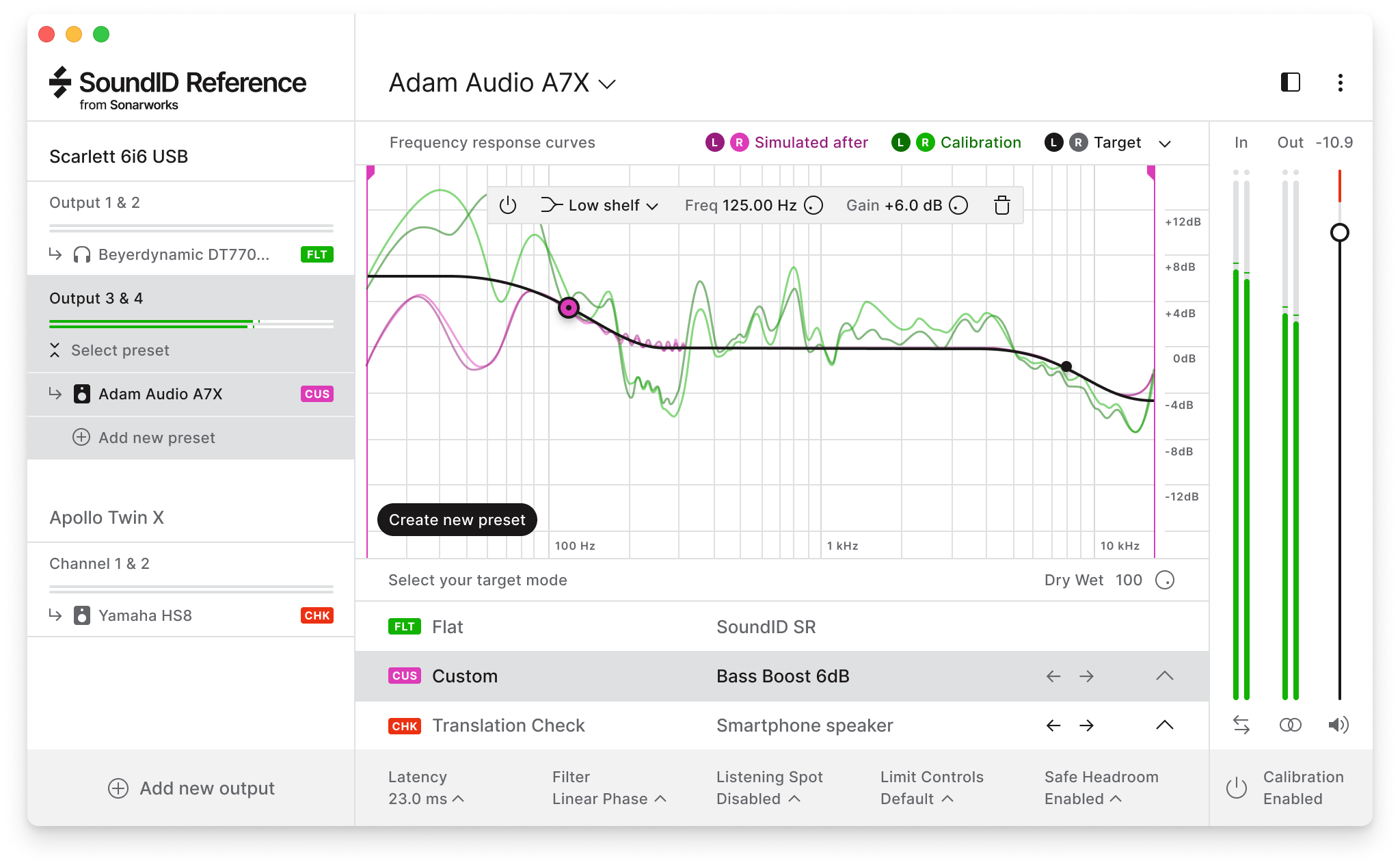 headphones with more than 280 headphone calibration profiles already included in the software as ready-to-use presets. With an applied calibration profile the software sets the frequency response target to be completely flat across all audible frequencies so you can trust that every mix will translate. You can also now make custom adjustments to the target curve in real time with the new custom target feature.