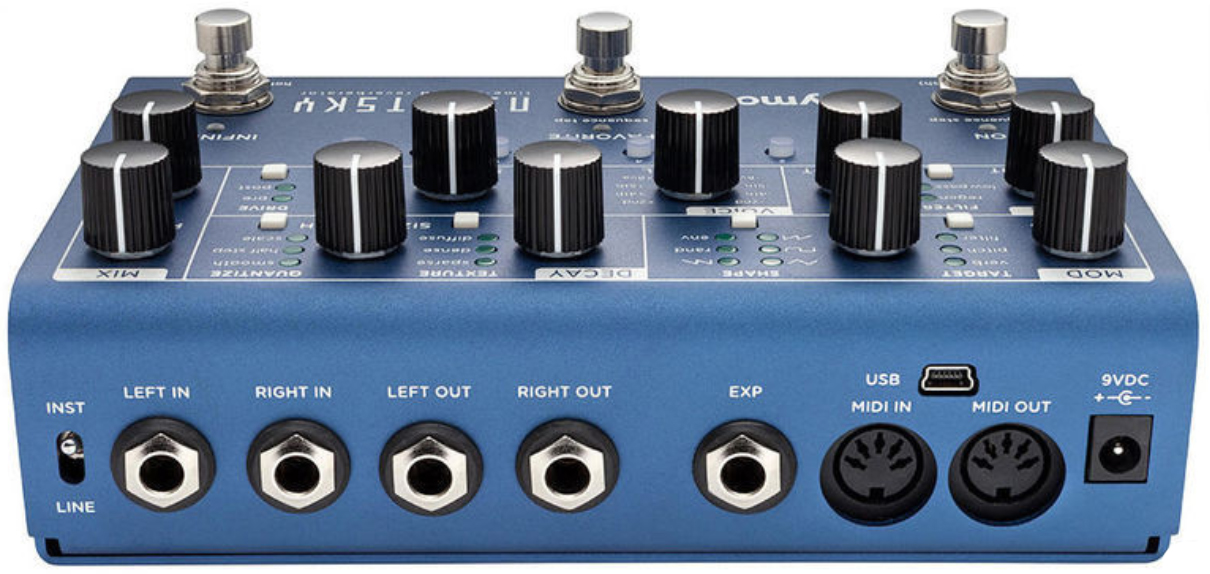- Push Buttons: Mod Target & Shape, Decay Texture & Quantize, Tone Filter Regen/Low Pass, Shimmer Input/Regen, Glimmer High Low, Drive Pre/Post, Sequence 1-8
