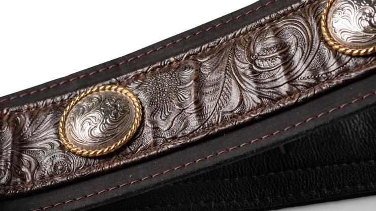With nickel conchos embedded in the leather, this is one of our most unique and beautifully appointed straps. Made in the USA.