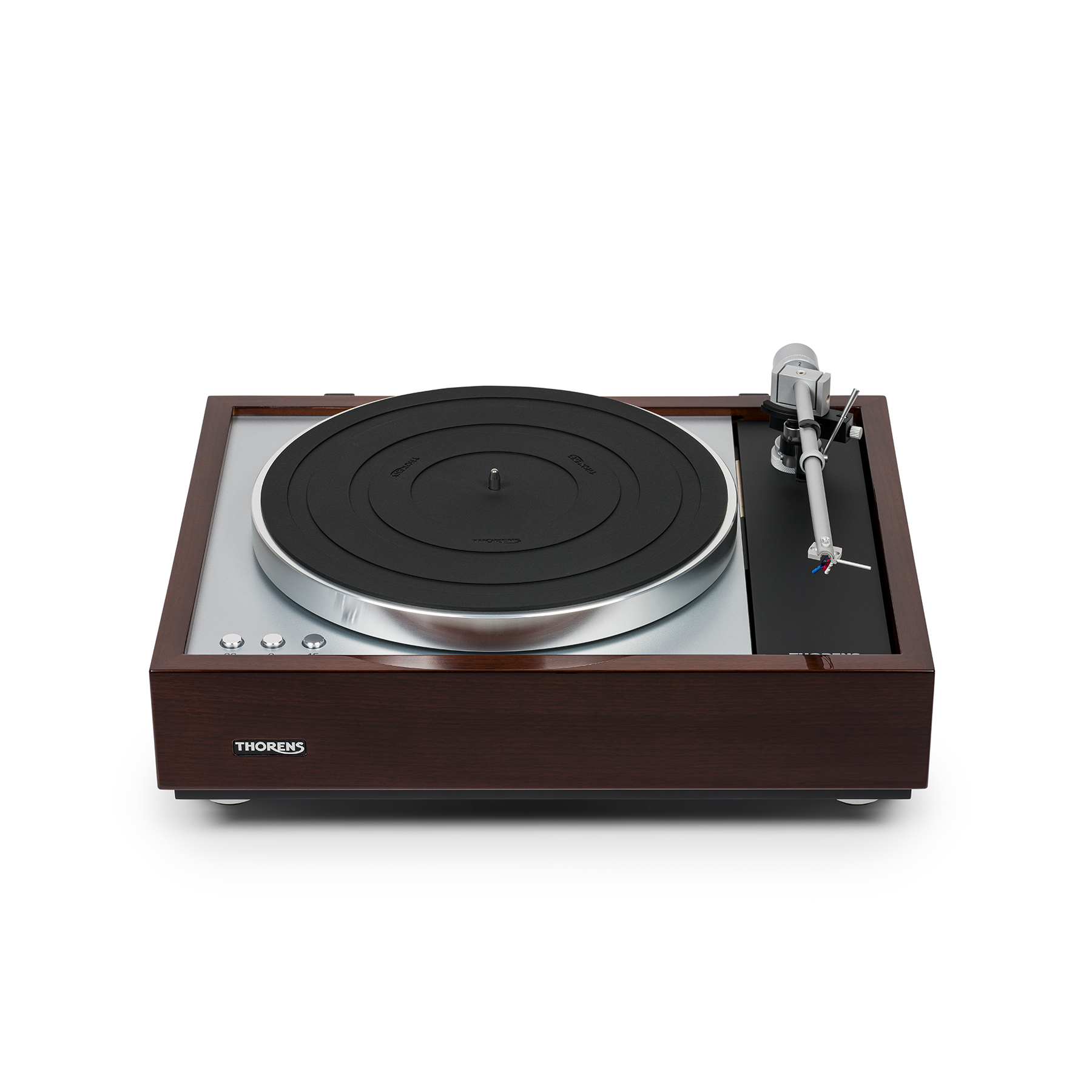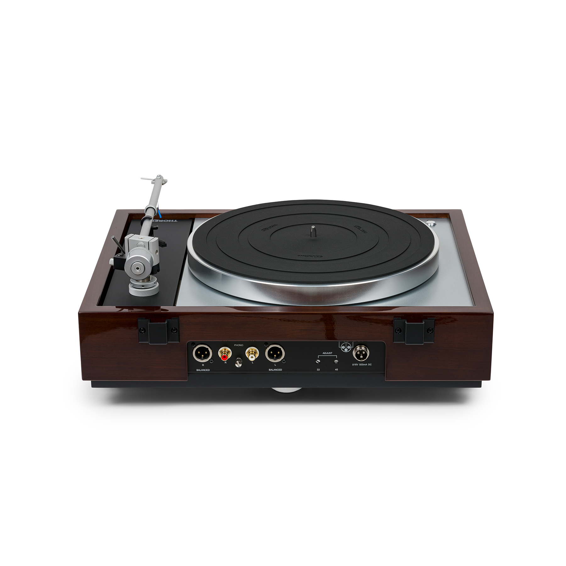 The Thorens TD 1600 is equipped with a 9" (232.8 mm) Thorens TP 92 tone arm. The horizontal bearing of the TP 92 arm is a high precision ball bearing located under the tone arm tube at the same level as the diamond for better stability. The counterweight, decoupled by two rubber rings, is also at the same level. The Thorens TP 92 tone arm tube is made of high quality cold forged aluminium. During the design of the arm, a laser vibrometer was used to analyse the resonances of the tube, allowing Thorens engineers to target specific frequencies and thus ensure almost no unwanted vibrations.