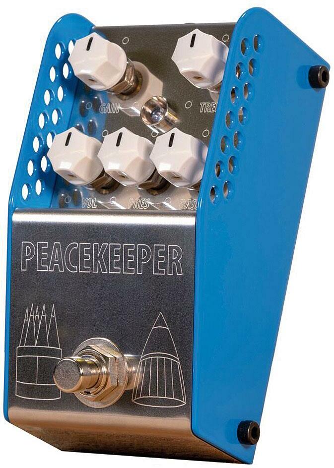 The PEACEKEEPER is our take on a low gain overdrive designed to suit all guitars and all amps whilst delivering the sweetest on the edge to crunch tones you have ever heard. Hyperbole aside, this pedal has some very cunning tricks up its sleeve, by combining a post gain active Treble and Bass circuit with a pre-gain Mids/presence control you are able to tailor the overdrive character and tonality to your exacting needs. The pre-gain mids control allows you to move from a very smooth mid scooped gain type to a more pronounced mid humped gain with all the subtleties in between. Post gain the active treble and bass controls adapt that focussed gain stage to achieve the tonality you desire/need. Used as a subtle boost into your amp (ala Klon style) or as an "on the Edge" overdrive, the PEACEKEEPER will make you wonder how you sound so good!