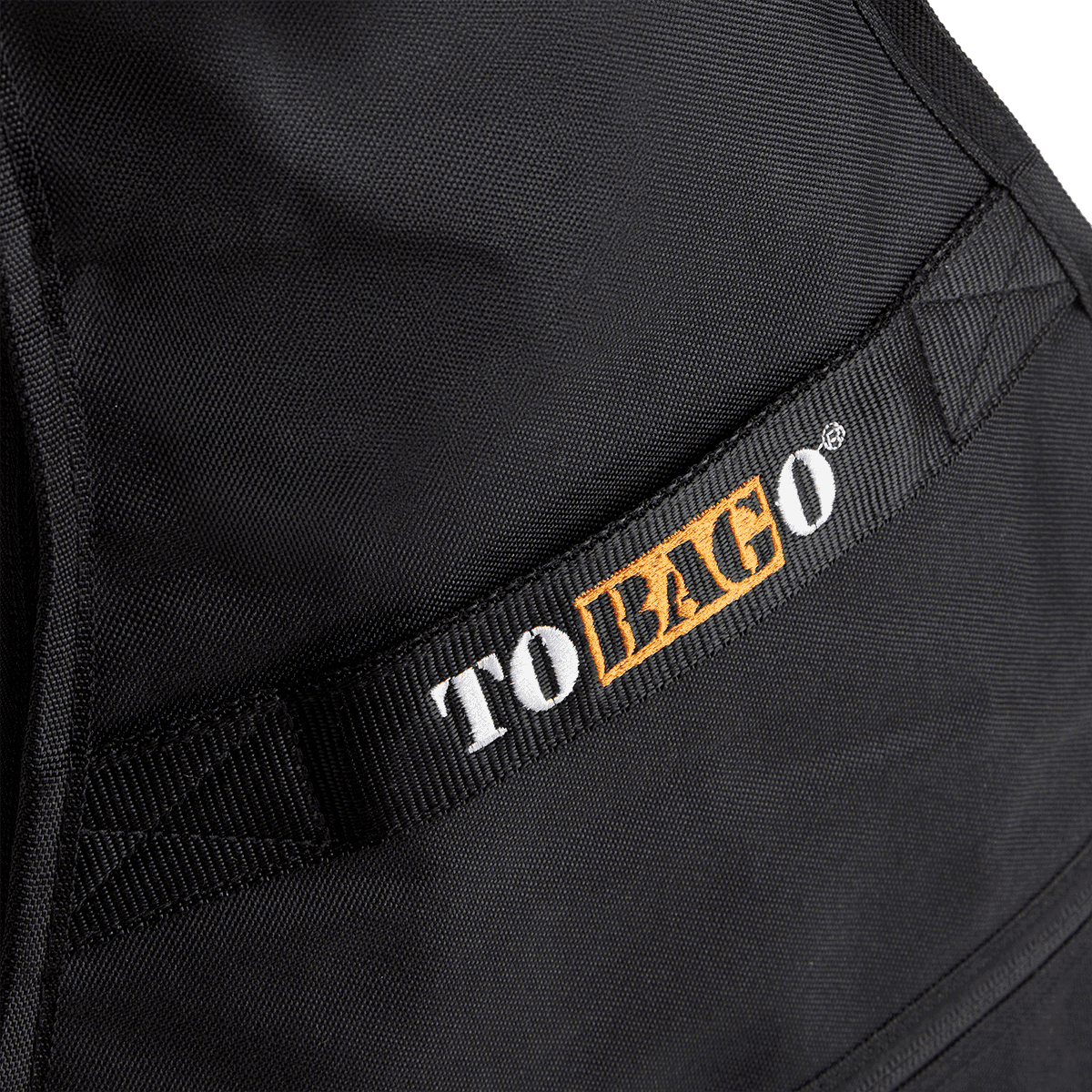 Equipped with a side handle and a front handle, both featuring the Tobago logo, the bag offers a secure grip. The adjustable straps offer various carrying options, adapting to the needs of acoustic guitarists.