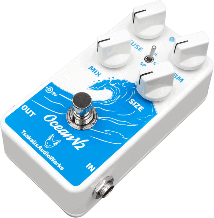 The Ocean was designed to produce studio quality classic and ambient reverb, enabling you to set different moods without having to sacrifice too much precious pedal-board space due to its small size. It offers a wide range of textures, from thick, endless hall reverb to symphonic shimmer and vintage spring reverb.