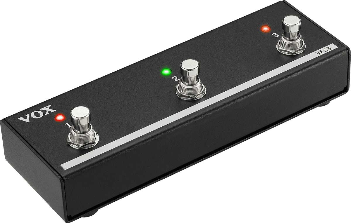 3-button footswitch for Vox MiniGo 10 and 50. It allows tempo changes, delay/reverb activation, looper functions and program changes.